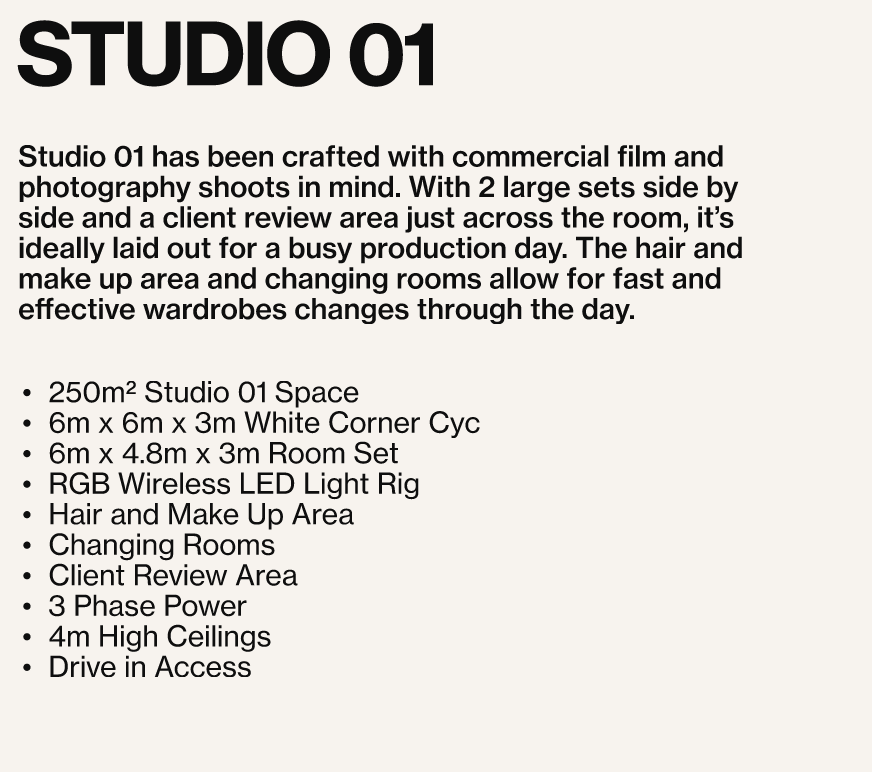 - Internal Spaces Available: Open Plan Studio 01 / Dressing Room