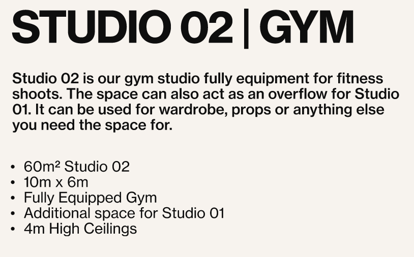 A Warehouse Studio in central Dublin that’s the perfect blank canvas for shoots with equipment. A customisable space that can take larger shoots and crews made of Studio 01, Studio 02 (Gym) and Vocal booth.